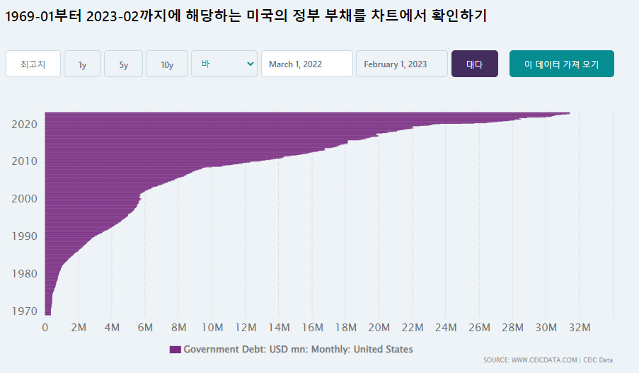 아래의 차트는 1969년 6월부터 2023년 2월까지 미국 연방정부의 부채 차트이다.1969년 6월 미국 연방정부의 부채는 약 3천5백억 달러였지만 2023년 2월에는 31조 4천억 달러에 달한다.