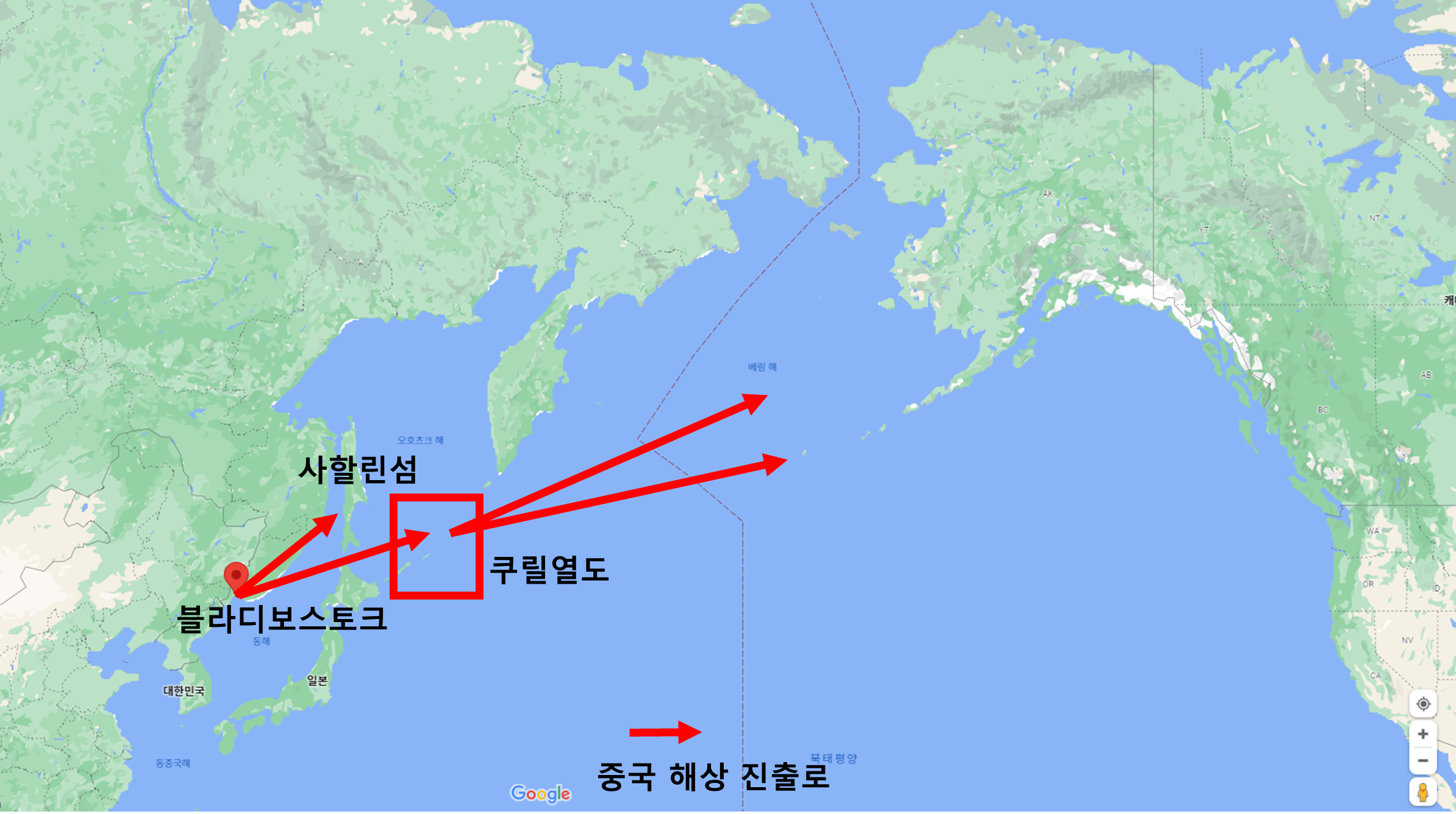 일단 우리는 블라디보스토크의 위치를 확인해보자. 아래의 그림은 블라디보스토크의 위치와 사할린섬 쿠릴열도의 위치를 표기하였다. 그리고 붉은 화살표는 중국의 해상 진출로를 필자가 예상하여 표기한 것이다. 자~ 이제 보이는가? 이는 중국이 미국과 직접 북태평양을 두고 국경을 맞대는 상황을 연출할 수 있음을 보여주고 있다.