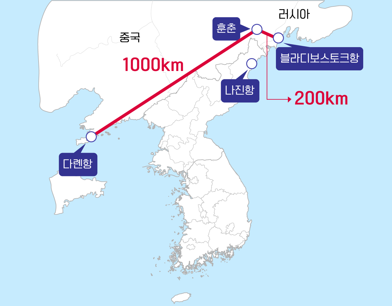 대부분의 언론들은 러시아와 중국의 경제 협력에 관하여 보도하고 있다. 중국의 만주지역인 동북삼성에는 항구가 없다. 중국은 블라디보스토크를 사용함으로써 동북삼성으로의 물자 운송이 유리해졌으며 운송 비용을 대폭 절감할 수 있게 되었다. 즉, 다롄항에서 훈춘까지 육로로 1,000km 물자를 운송하던 중국이 해로로 블라디보스토크까지 물자를 운송하고 훈춘으로 육로로 운송하는 전략이 가능해졌다.