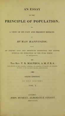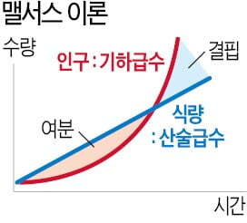 토머스 로버트 맬서스는 그의 저서 인구론을 통하여 인구 증가와 식량 증가의 관계를 서술하였다. 그는 인구의 자연적 증가는 기하급수적(등비급수)으로 증가한다고 주장하였다. 그러나 그에 비하여 식량의 증가는 산술급수적(등차급수)으로 밖에 증가하지 않으므로 결국 국가의 인구가 증가함에 따라 식량이 부족해진다고 주장한다. 즉 아래의 그래프와 같다.