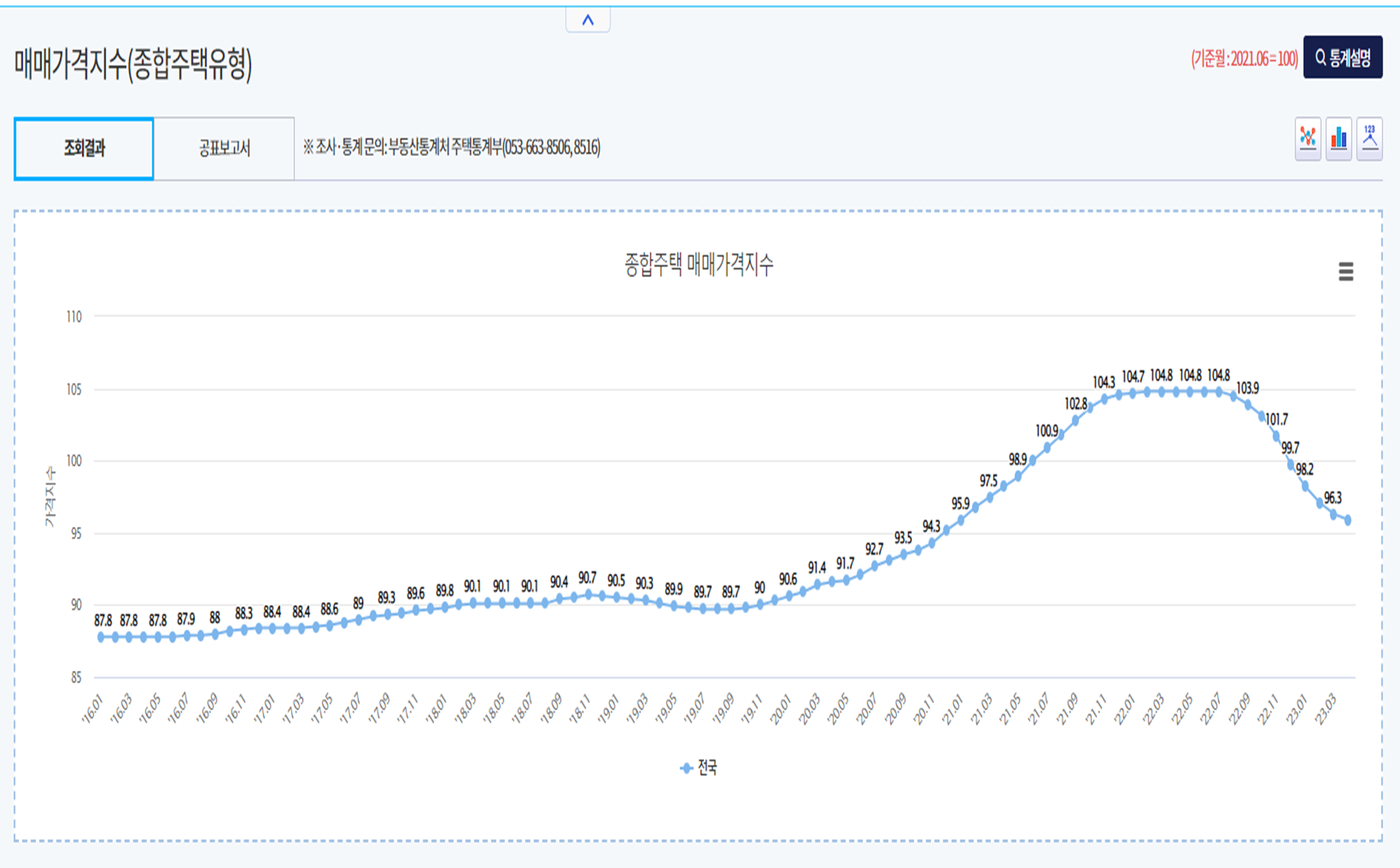 <참고 사이트 : R-ONE 부동산 통계뷰어, 매매가격지수(종합주택유형), https://www.reb.or.kr/r-one/statistics/statisticsViewer.do?menuId=HOUSE_21111 >