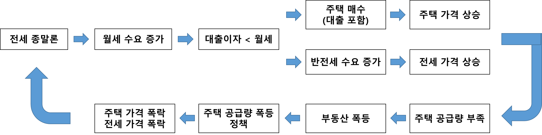 이 글을 읽는 분들은 왜 전세 종말론이 기회인지 궁금해하실 것이다. 전세 종말론이 대두되면 전세 시장이 월세 시장으로 수요가 이동한다. 월세 시장의 수요가 증가하면 월세가 상승한다. 이제 월세가 대출 이자보다 높아지게 될 경우, 자본력이 있는 수요자들은 주택을 매수하게 된다. 그런데 자본력이 없는 수요자들은 반전세로 수요를 이동한다. 주택을 매수하게 되니 주택 가격이 상승한다. 그러하니 다시 전세 가격이 상승한다. 그러니 결론은 뭐다? 주택 가격과 전세 가격이 상승한다. 대출 이자보다 월세가 높아지게 되면 다시 전세는 부활하게 되고 월세를 감당하느니 대출 이자를 감당하는 것이 더 저렴해진 상황이 연출되면 주택을 매수하게 된다. 이를 그림으로 도식화하면 다음과 같은 현상이 발생하는 것이다.