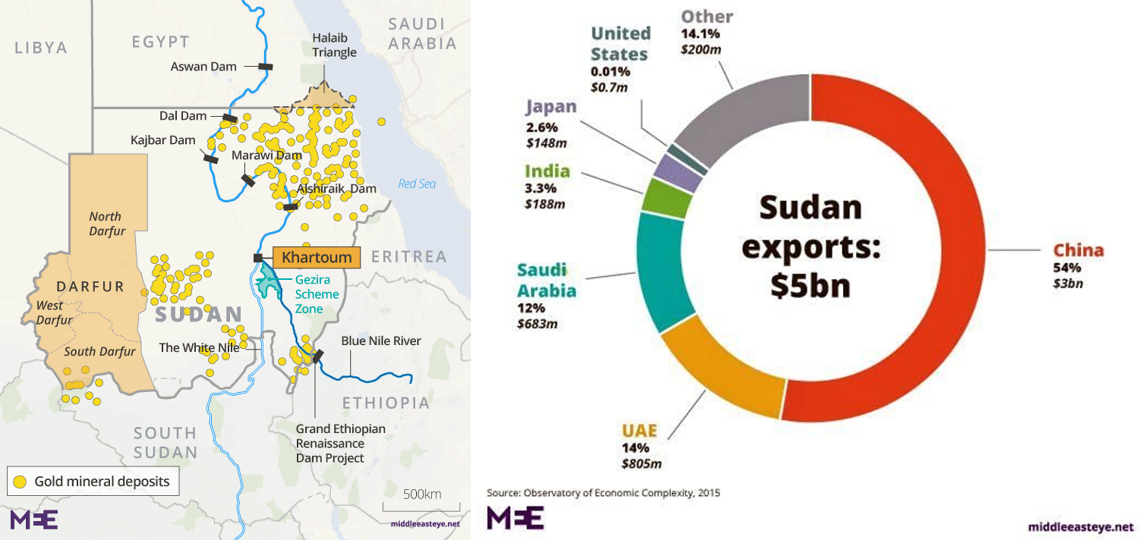 아래의 그림 좌측은 수단에 금광의 분포도이며 우측 사진은 수단의 주요 수출국가이다. 중국과 UAE, 사우디아라비아가 보일것이다. 그렇다. 수단은 BRICS 국가가 자원을 확보하는 국가이다. 따라서, 미국과 서방 세력은 수단에서 중국-러시아 세력을 몰아낼 필요성이 생긴 것이다.