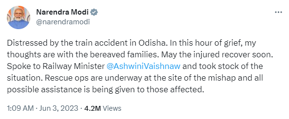 인도 모디 총리는 자신의 트위터를 통하여 비통한 심정을 표현하였으며 인도 오디샤주는 6월 3일을 애도의 날로 지정하였다.