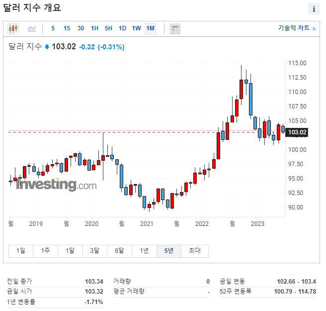 미국이 현재 BRICS 세력에게 도전을 받고 있지만 아직도 미국의 달러는 기축통화이다. 탈달러가 가속화되고 있다고 주장하는 일부 언론의 목소리는 이 차트 한 방에 거짓임을 증명한다. 바로 미국 달러 인덱스이다. 달러 인덱스(DXY)가 80이하면 약달러 100 이상이면 강달러이다. 만약 미국 달러가 무너졌다면 달러 인덱스가 곤두박질쳐야 한다. 그런데 아직도 100을 유지하고 있다. 세계 경제는 아직도 달러로 움직이고 있다. 이 점을 우리는 꼭 상기하고 있어야 할 것이다.