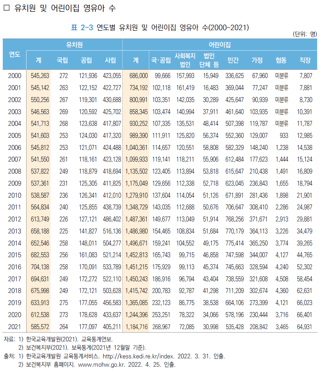 대한민국은 앞서 언급한 것처럼 아이를 어린이집에 맡기고 부모가 맞벌이를 한다. 2021년 영유아 주요 통계에 따르면 유치원에 다니는 아이는 총 585,572명이고 어린이집에 다니는 아이의 수는 총 1,184,716명이다. 2017년도 이후 어린이집과 유치원을 다니는 아이의 수가 감소하고 있음을 확인할 수 있다. 하지만 이는 아이를 키우는 방식의 변화 때문에 수치가 줄어든 것이 아니라 출산율이 낮아지면서 발생한 것이라고 해석하여야 한다.