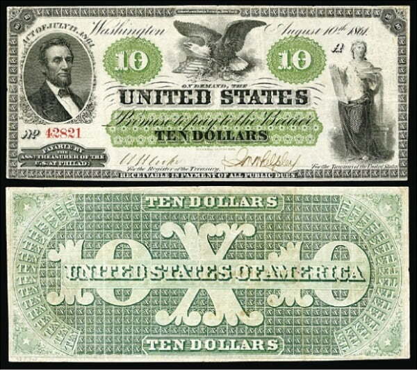 에이브러햄 링컨은 남북전쟁 수행 중 민간 은행에 막대한 부채를 지게 되었다. 그리고 민간 은행에 막대한 이자를 더 이상 감당할 수 없는 지경에 다다랐다. 전쟁 중에 자본이 없다는 것은 곧 전쟁의 패배를 의미하였다. 따라서, 에이브러햄 링컨 대통령은 재무부를 통하여 전쟁을 수행할 수 있도록 하기 위하여 미합중국 지폐를 발행하게 하였다. 이 지폐는 녹색으로 인쇄되어서 '그린백(greenback)'이라고 불렸다.