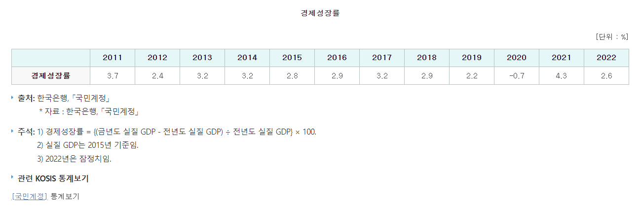 대한민국 2011 ~ 2022 경제성장률 표,&nbsp;이미지 출처 : 국가지표체계, https://www.index.go.kr/unify/idx-info.do?idxCd=4201#