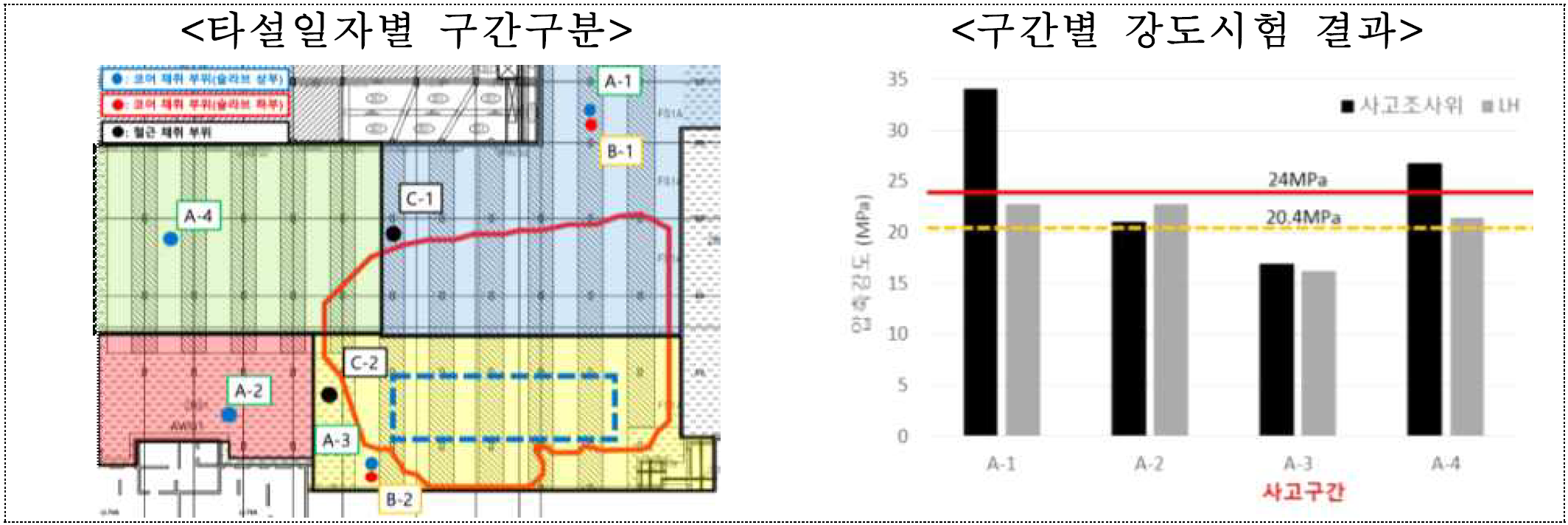 둘 째, 콘크리트 품질의 미흡이다. 콘크리트를 타설한 구역과 일자로 총 4개의 구역으로 나누었고 각각 콘크리트의 강도를 평가하였다. 콘크리트 강도 평가 기준은 KCS 14 20 10(일반콘크리트) 3.5.5.7 코어공시체는 콘크리트 강도가 설계기준 강도(24MPa)의 85% 이상이어야 한다. 이 기준에 따르면 콘크리트는 최소 20.4MPa 이상이 되어야 한다.