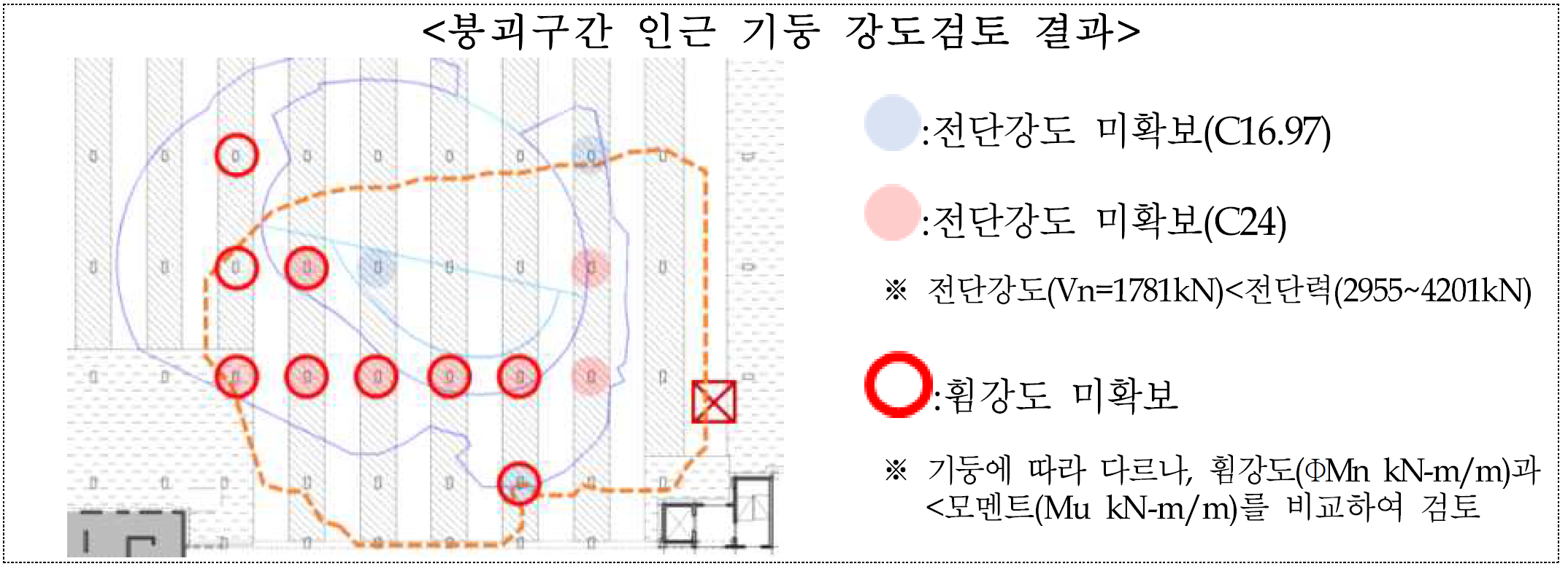 넷 째, 첫 번째 ~ 세 번째 원인의 영향을 고려한 분석의 결과, 기둥 32개소 중 11개소는 전단강도가 부족하였고 9개소는 휨강도가 부족하였으며 이 중 7개소는 전단강도와 휨강도 모두 부족한 것을 확인하였다. 만약에 최소 11개소의 기둥에 전단보강근이 설계되어 시공되었다면 아파트 기둥으로 구성된 구조물에 전단강도가 확보되어 붕괴가 발생하지 않았을 것이다.