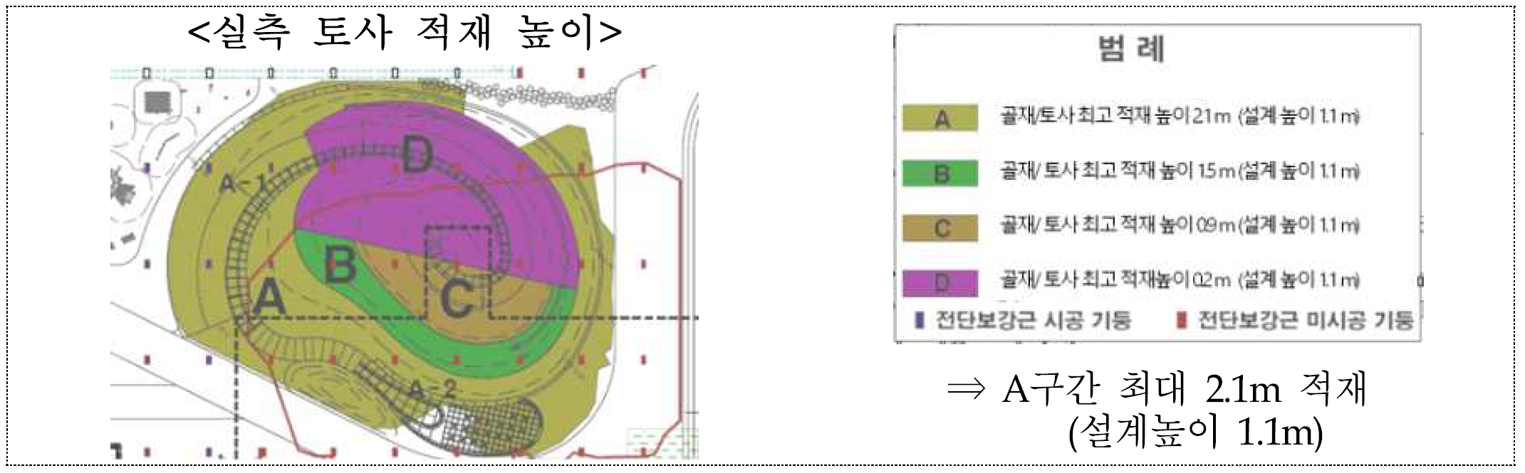 셋 째, 식재 공사(조경 공사를 위한 기초적인 작업)를 위하여 아파트 건설 현장에 토사를 쌓아 올렸는데 설계값은 높이가 1.1m였다. 그러나 실제로는 더 많은 토사를 쌓아 올려 최대 2.1m까지 도달하도록 한 것이다. 이는 즉. 토사가 기둥에 적용되는 분포하중이 실제 설계값보다 더 크다는 사실을 알 수 있다.