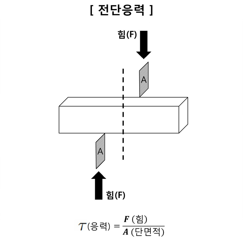 전단응력은 크기가 같고 방향이 서로 반대되는 힘을 단면적으로 나누어 정의한다. 응력은 쉽게 말하면 저항력이다. 힘이 2차원 단면에 작용할 때 영구변형이 발생하지 않는 저항력을 의미한다.