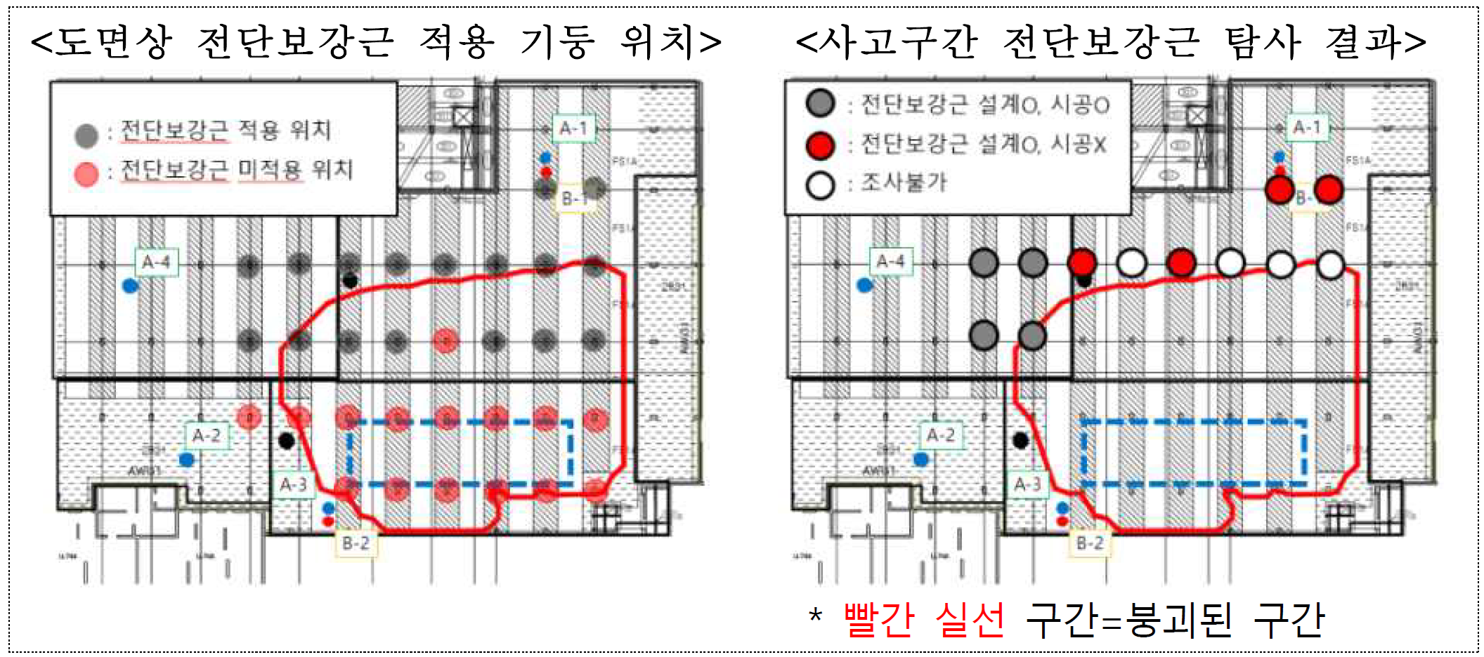 시공 : 32개소 중 붕괴된 위치 등 확인이 불가한 기둥을 제외하고 8개소 조사 결과 4개소에서 설계와 다르게 전단보강근을 누락하였다.