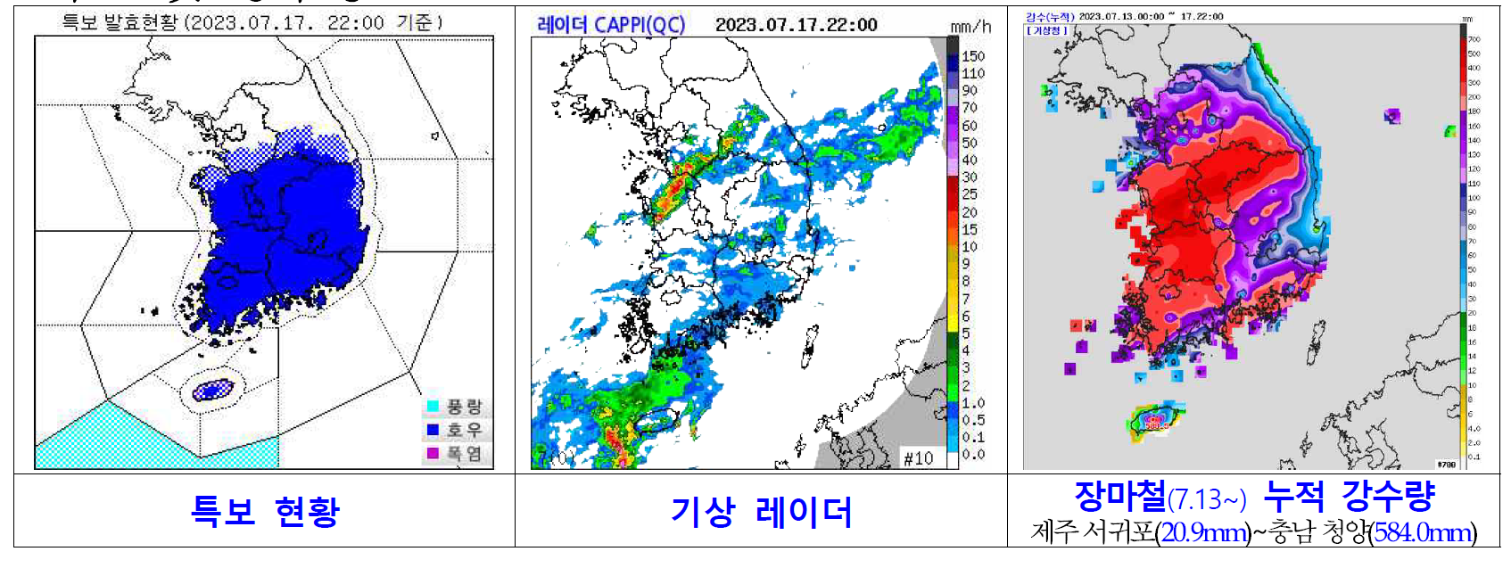 2023년 7월 17일 기준 대한민국 폭우 기상 현황과 강수량