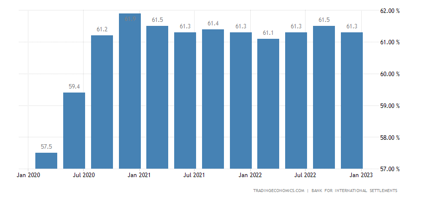 아래의 그림은 중국의 GDP 대비 가계부채이다. 2023년 1월 기준 중국의 GDP 대비 가계부채는 61.3%이다. 중국의 가계부채 비율은 높은 수치이다. 그러나 중국의 GDP는 일대일로 프로젝트를 무리하게 진행하여 중국 공산당 중앙 정부의 부채가 어마무시하다. 필자는 이전 포스팅을 통하여 중국은 일대일로 사업으로 엄청난 자금을 쏟아부었다는 사실을 증명하였다. 중국은 일대일로 사업을 시작한 2000년도 이후 18년간 중국은 165개국의 1만 3천 개가 넘는 프로젝트에서 최소 8천430억 달러(2023년 5월 7일 환율 기준, 1,118조 6,610억 원)를 지출하였다. 그러나 중국은 천문학적인 금액을 사용하고도 투자금을 회수하거나 흑자로 돌아선 프로젝트는 전무하다. 왜냐하면 아직 미완성 상태인 프로젝트가 많은 데다가 코로나 19 창궐과 신 냉전 체제로 인하여 아직 해당 프로젝트를 마무리 짓지 못하고 있기 때문이다. 즉, 중국은 밑 빠진 독에 달러를 부은 셈이다.
