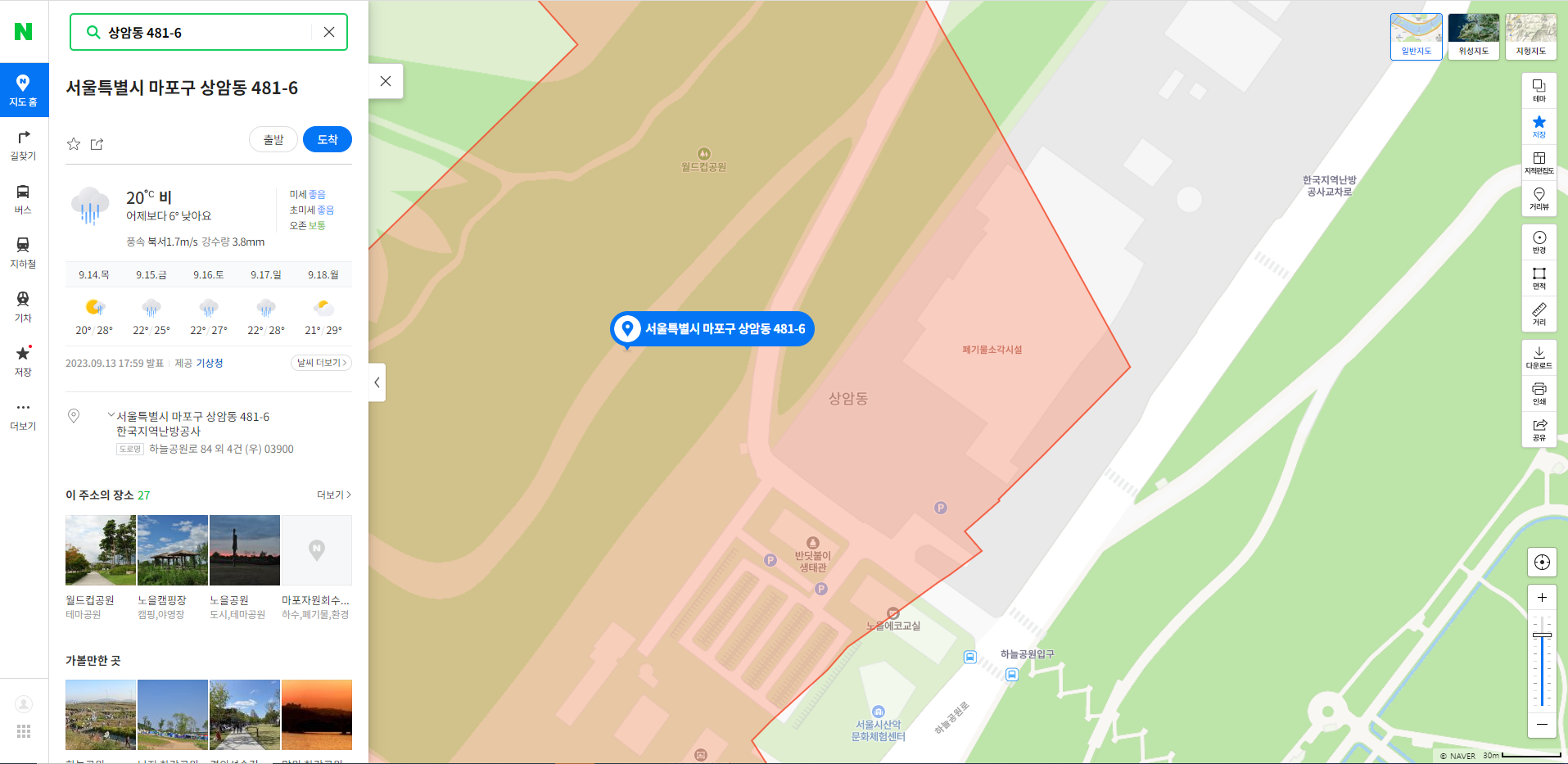 현재 대한민국에서 소각장 확정된 곳은 바로 서울특별시이다. 서울특별시는 광역자원회수시설(생활폐기물 소각장) 마포구 상암동 481-6 등 2개 필지를 신규입지로 최종 선정하였다. 문제는 해당 위치 주변에 이미 소각장이 존재하고 있으며 일일 750톤의 쓰레기를 소각하고 있다. 그렇다면 위치를 확인해 보자.