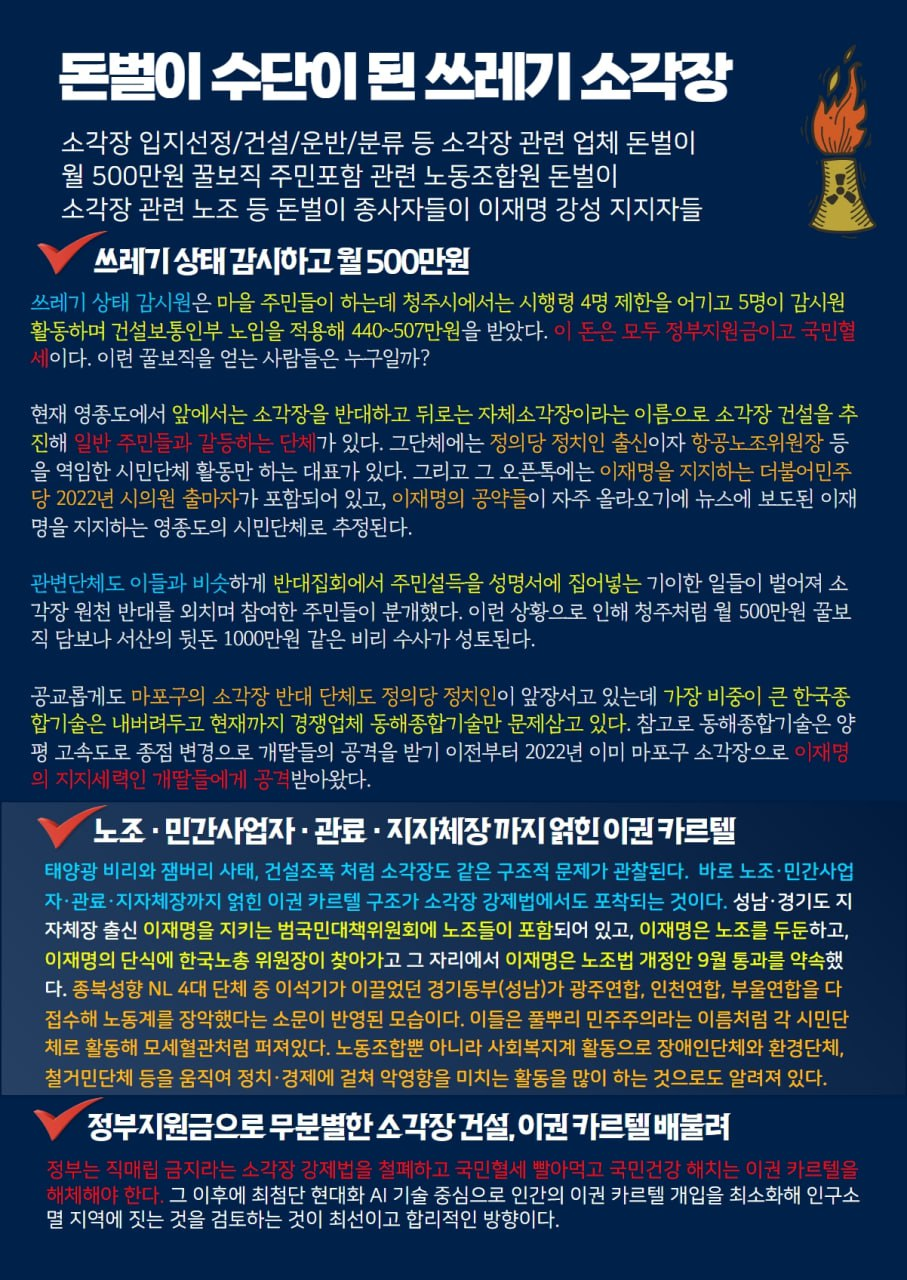 소각장 입지선정/건설/운반/분류 등 소각장 관련 업체 돈벌이, 월 500만 원 꿀보직 주민포함 관련 노동조합원 돈벌이, 소각장 관련 노조 등 돈벌이 종사자들이 이재명 강성 지지자들