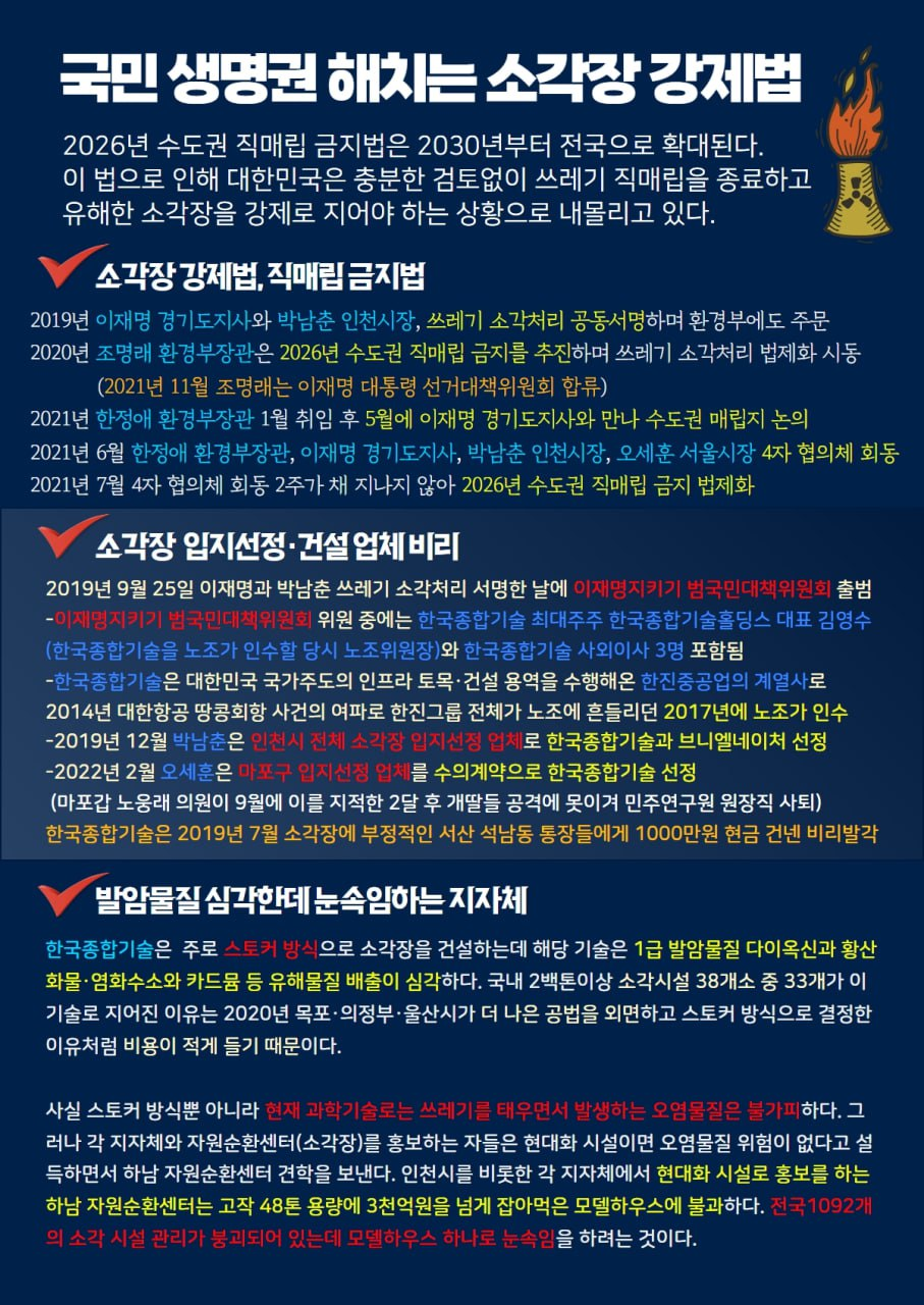 영종권익실천회는 인천광역시 서부권역 소각장 광역화 후보지 5곳을 영종도에 몰빵 선정에 절대 반대 의사를 표명하며 영종도 주민의 권익을 위하여 활동하는 단체이다. 영종권익실천회는 쓰레기 소각장 관련 다양한 언론 보도와 자료를 수집하였고 이를 토대로 전단지를 제작 및 배포한다. 이 이야기는 영종도만의 이야기가 아니다. 현재 서울특별시 마포구도 해당되며 곧 소각장 광역화 후보지가 선정될 대한민국 전국이 대상이 되는 이야기이다. 대한민국의 영토와 환경을 쓰레기 소각으로 인한 매연과 발암 물질로 오염시키려고 하는 이 악법을 폐지해야 한다. 또한, 쓰레기 소각장을 이용하여 돈벌이의 수단으로 만들어버린 세력에 대하여 강력히 조사하여 법에 맞게 엄정히 처벌하여야 한다. 필자는 해당 내용을 공유하고자 이 포스팅을 작성하였다.