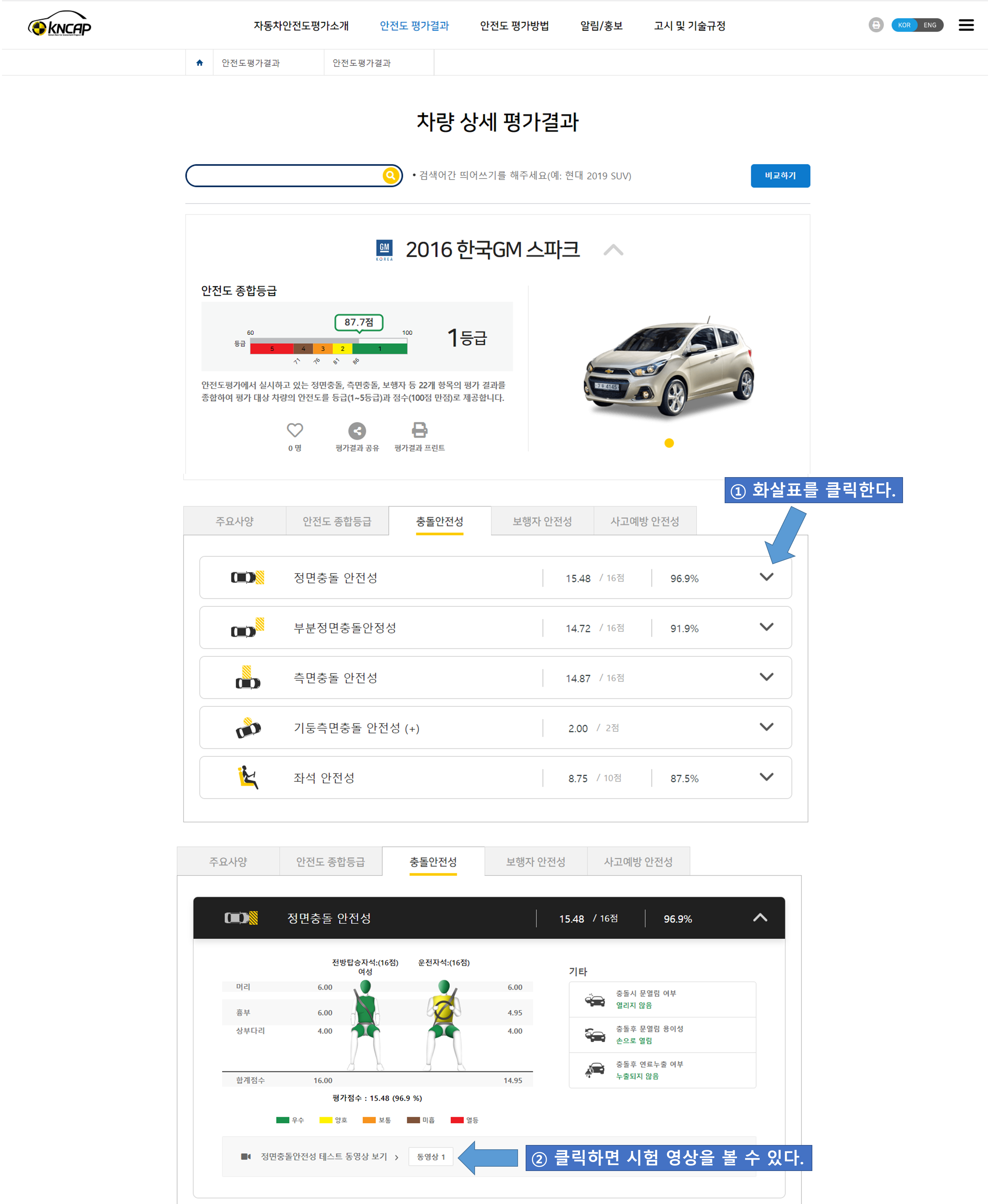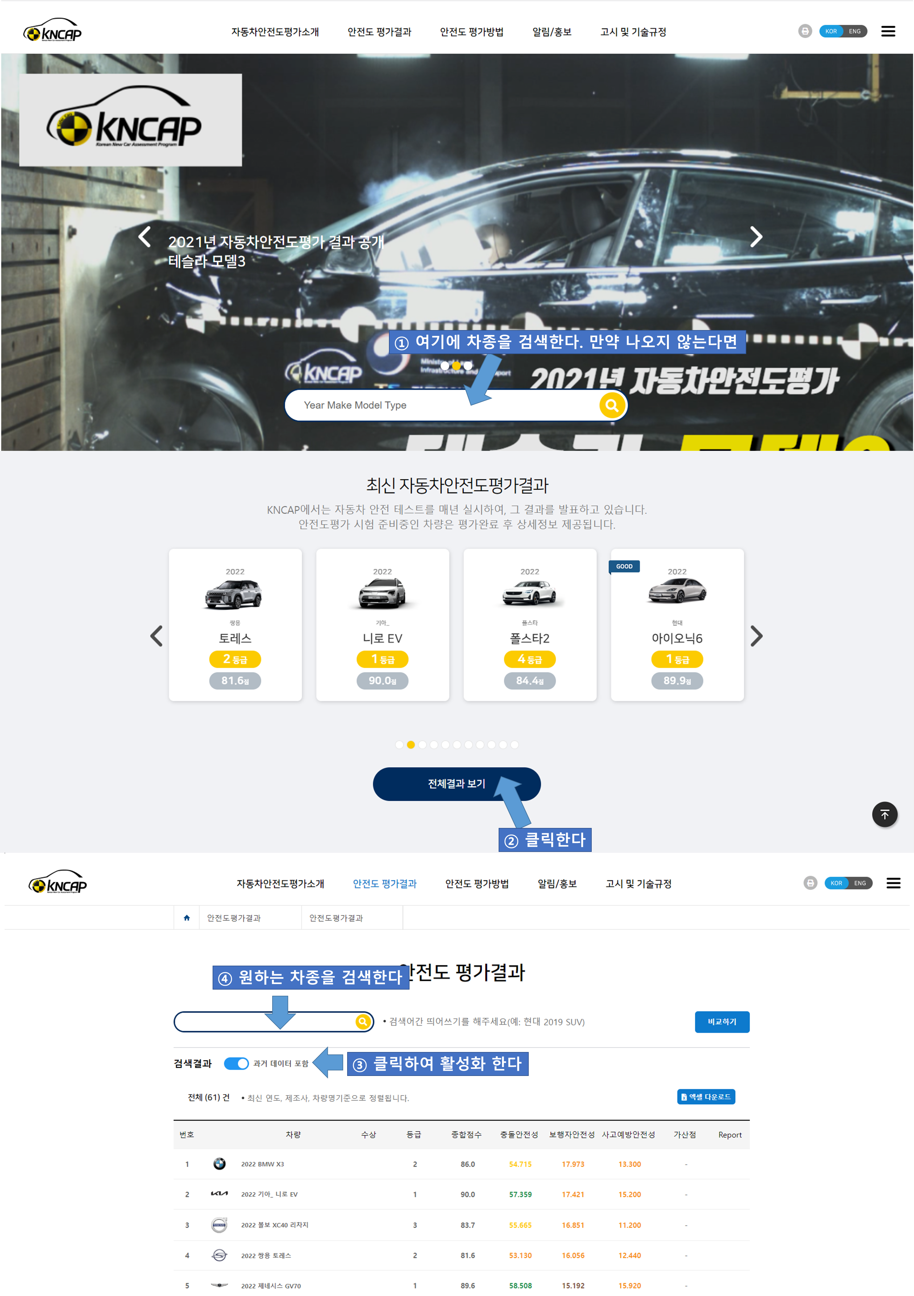포털사이트 검색창에 kncap를 검색하여 http://www.kncap.org/indexNew.jsp 사이트에 접속한다. 해당 사이트는 한국교통안전공단 자동차안전연구원에서 자동차안전도평가 영상과 그 결과를 대중에게 공개하는 사이트이다. 대한민국에서 현재 유통되고 있는 국내제조사 차량과 해외수입 차량의 충돌테스트 결과를 볼 수 있다.
