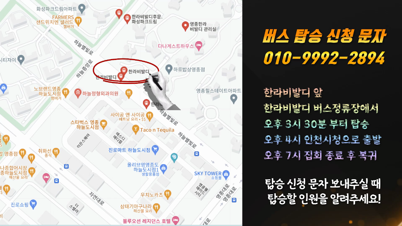 - 영종하늘도시에서 전세버스를 대절하여 운영하고 있으므로 이를 이용하시는 것을 추천하며 아래의 핸드폰 번호로 버스 탑승 신청 문자를 미리 발송해 주시기를 바람