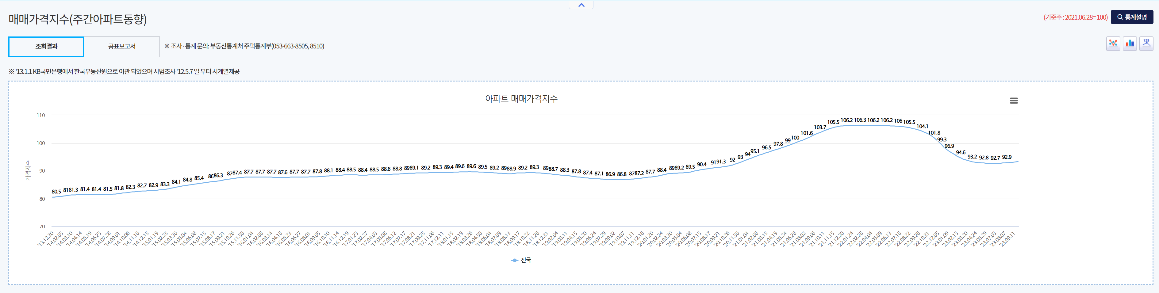 [ 참고 사이트 : R-ONE 부동산통계뷰어, 매매가격지수(주간아파트동향), 2014.01.01 ~ 2023.09.25, https://www.reb.or.kr/r-one/statistics/statisticsViewer.do?menuId=HOUSE_22110 ]