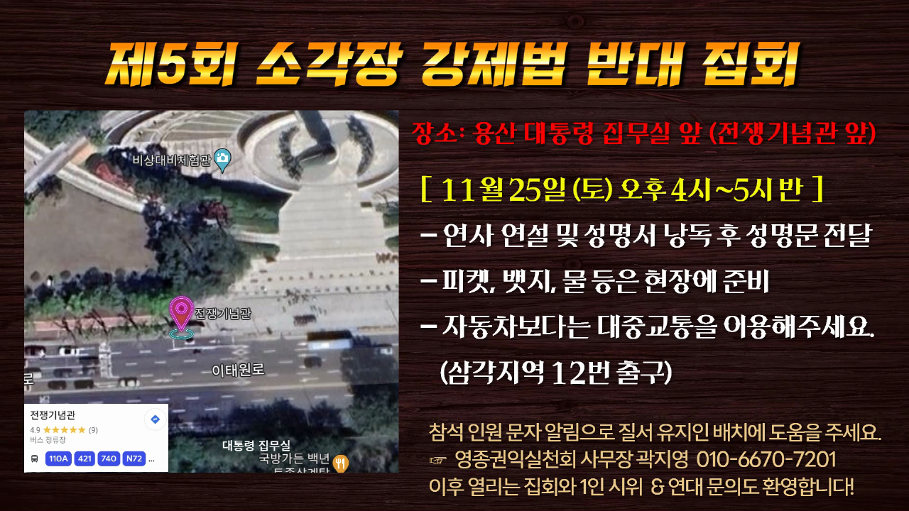 영종권익실천회와 대한민국국민 일동은 2023년 11월 25일 오후 4시부터 5시 30분 용산 대통령 집무실 앞(전쟁기념관 앞)에서 제5회 소각장 강제법 반대 집회를 진행하였다. 우리는 대통령과 대한민국 정부에게 전국에 쓰레기 소각장을 강제로 짓는 법안이 2021년부터 준비되어 지금 완성되었으며 전국에 쓰레기 소각장을 강제로 짓기 위한 움직임이 진행되고 있음을 알리기 위하여 이번 집회를 진행하였다. 정치권-지자체장-관료-민간업체-관변·시민단체-언론 등등 정말 다양한 세력이 쓰레기 소각장을 건설하기 위하여 이권 카르텔을 형성하고 있다. 이권 카르텔을 혁파하고 소각장 강제법을 철폐할 때까지 우리의 활동은 계속될 것이다.