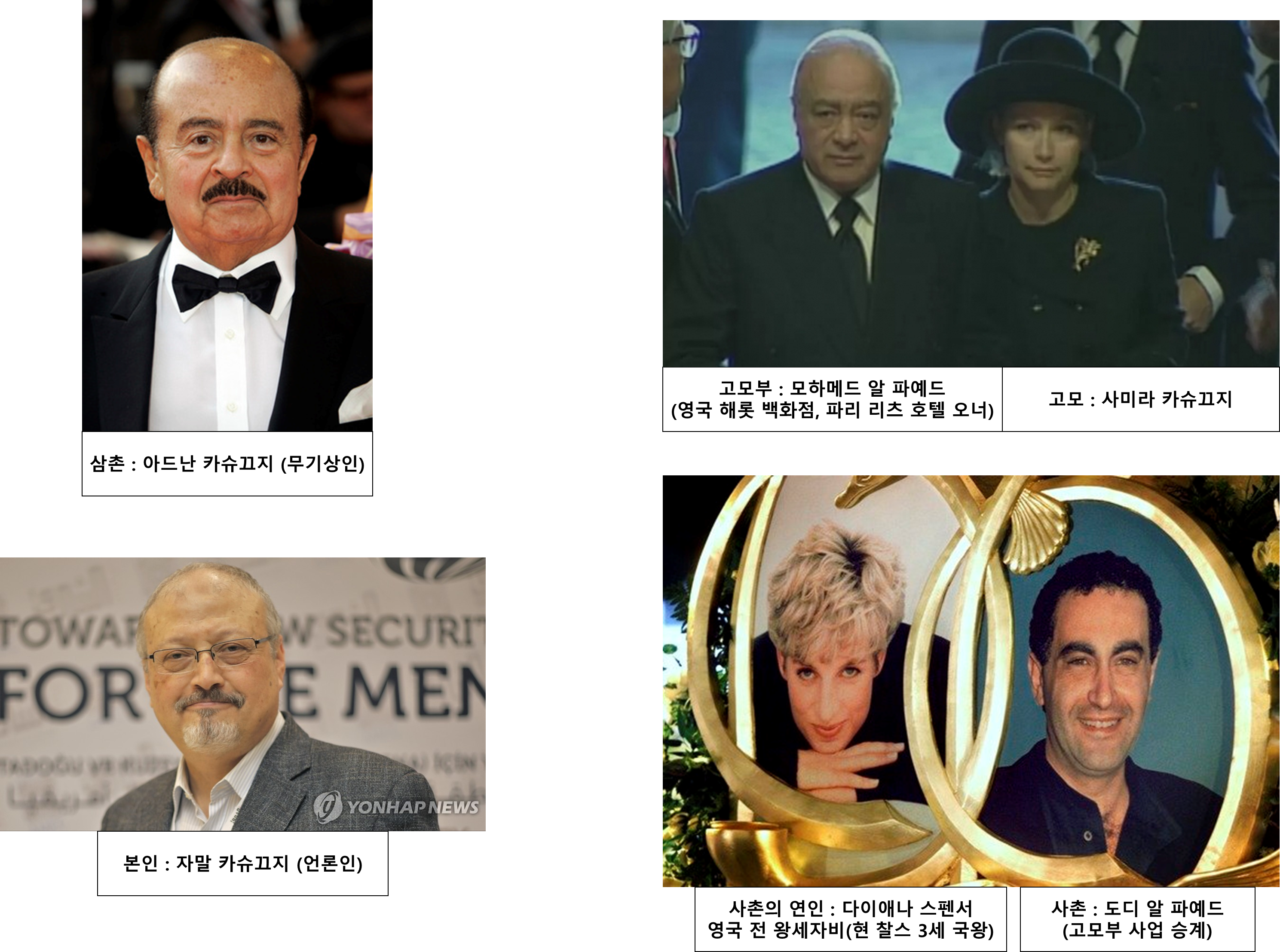 자말 카슈끄지의 가문은 유명한 인사가 정말 많다. 그의 삼촌 아드난 카슈끄지는 전설로 불리는 무기상인이었다. 우리나라에서는 로비스트 린다 김이 아드난 카슈끄지와 인연이 있었다고 주장하여 유명하다. 자말 카슈끄지의 고모 사마라 카슈끄지의 남편은 바로 영국 해롯 백화점, 파리 리츠 호텔의 오너인 모하메드 알 파예드이다. 그리고 사마라 카슈끄지와 모하메드 알 파예드 사이에 태어난 아들이 바로 영국 찰스 3세 국왕의 전처였던 다이애나 왕세자비와 연인이었던 도디 알 파예드였다. 즉, 자말 카슈끄지와 도디 알 파예드는 사촌 관계인 것이다.