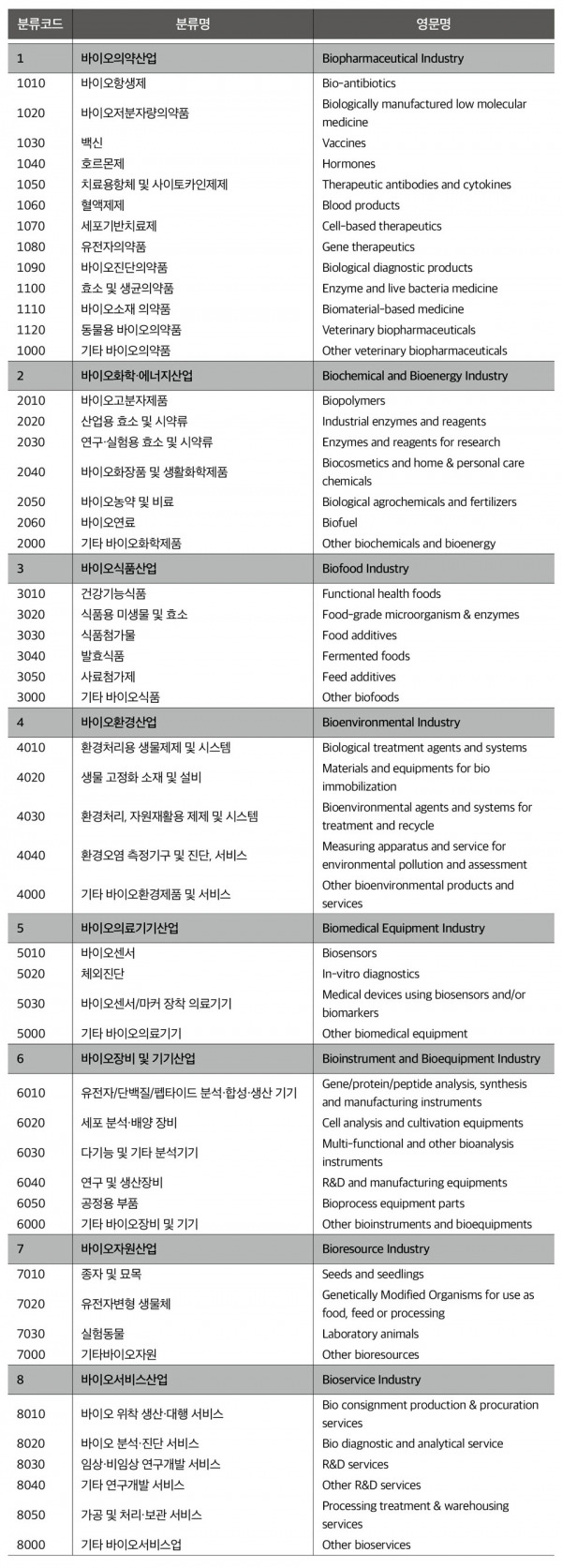 바이오산업은 특수성을 가지고 있다. 바이오기술을 바탕으로 생물체의 기능 및 정보를 활용하여 제품 및 서비스 등 다양한 고부가가치를 생산하는 산업이기 때문이다. 아래의 표는 바이오산업 분류체계(KS J 10069)에 명시된 바이오산업의 대분류 및 중분류 체계이다.