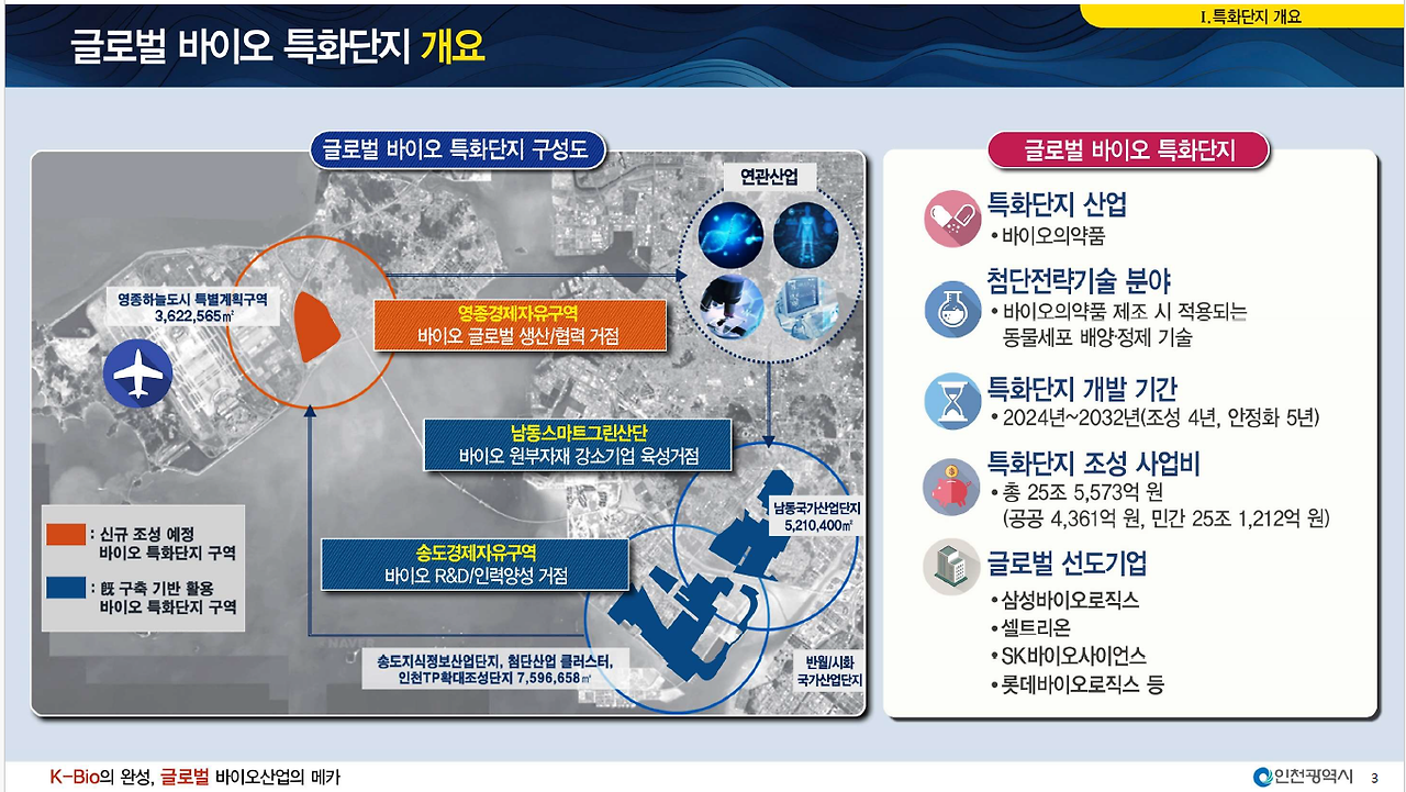 또 다른 전략은 바로 공공특화단지 조성이다. 특히 바이오특화단지를 조성하는 것이다. 아래의 사진과 첨부된 파일은 인천광역시가 제작한 "글로벌 바이오특화단지 육성계획" 자료이다. 그중 3페이지를 주목해 주시기 바란다. 남동스마트그린산단은 바이오 원부자재 강소기업 육성거점, 송도경제자유구역은 바이오 R&D/인력양성 거점, 영종경제자유구역 제3유보지는 바이오 글로벌 생산/협력 거점이다.