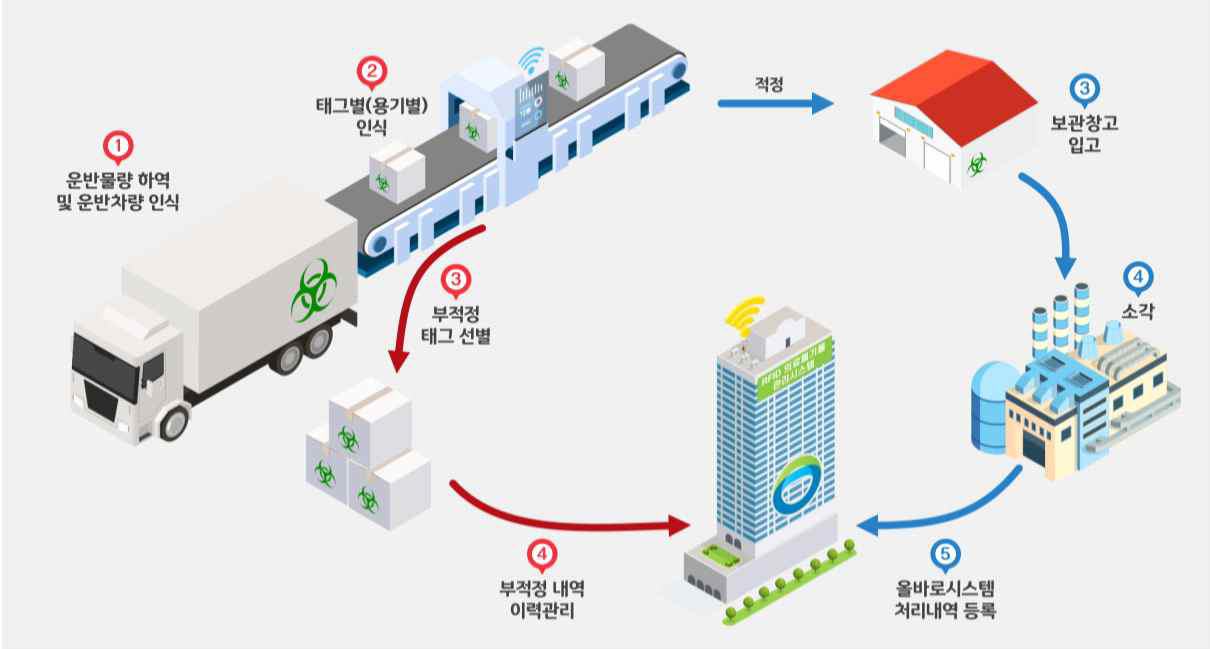 의료폐기물은 전용용기에 담아 운반해야 하고 각 전용용기에 전자태그를 부착하여 추적이 가능하도록 해야 하며소각업체로 이송 및 소각 처리 하게 되어있다. 아래의 파일은 2023년 3월 환경부에서 발행한 의료폐기물 처리 지침이다.
