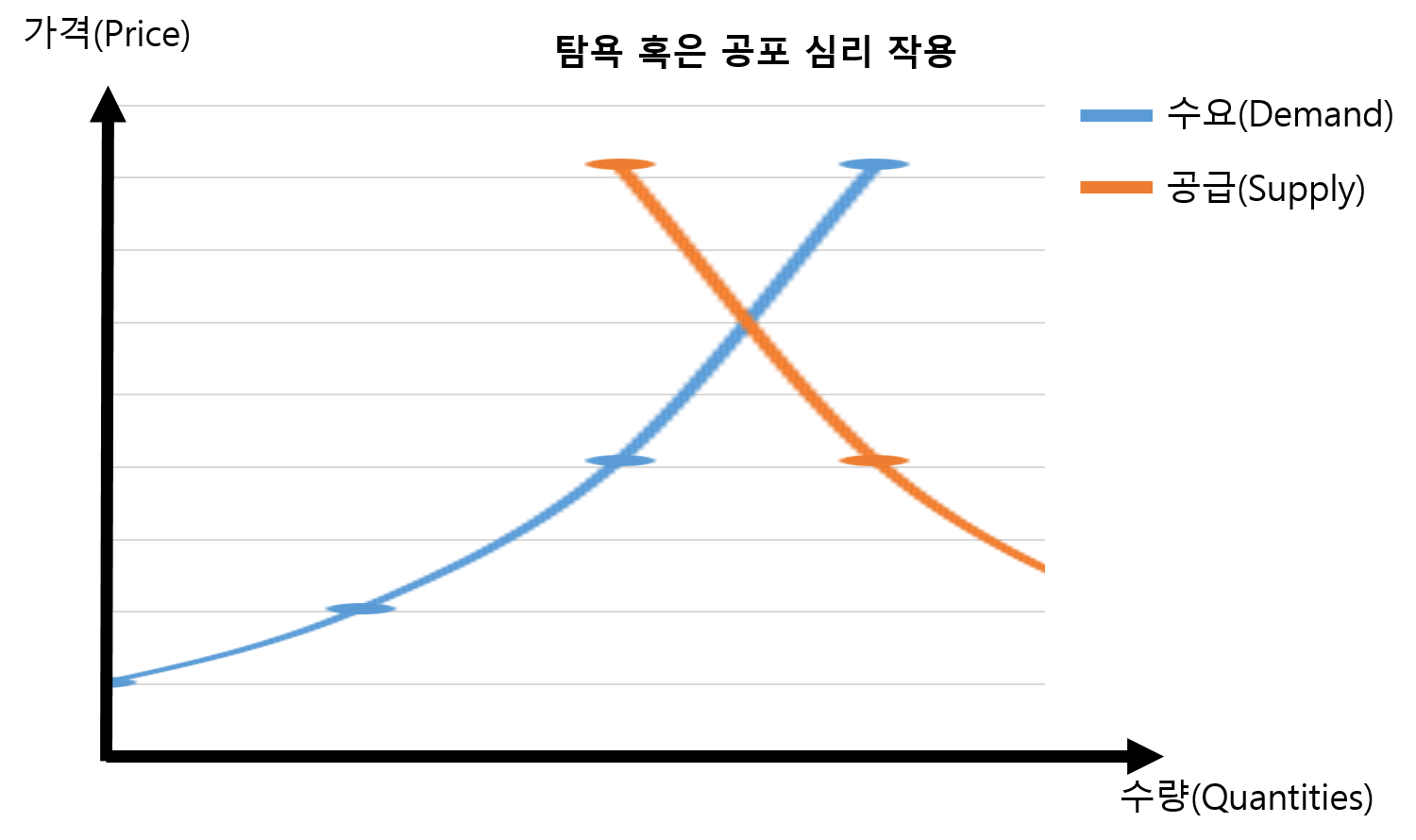 그렇다. 필자는 수요와 공급 법칙 뿐만 아니라 탐욕과 공포 심리를 같이 참고해야 한다고 생각한다. 공급량이 급감하고 수요량이 폭증하게 되면 공포가 증가한다. 이러한 공포는 경제 참여자가 필수 소비재를 사재기하거나 필요 이상으로 구매하려고 한다. 이렇게 될 경우 더더욱 수요량이 폭증하여 가격을 상승시키는 요인으로 작용한다. 수요와 공급의 법칙으로 보자면 아래의 그림과 같이 일차 함수였던 수요 곡선이 이차 함수 혹은 지수 함수로 변화하여 급격히 상승하게 된다. 즉, 수요에 공포가 더해지는 상황이 연출되는 것이다. 물론 탐욕일 때도 수요는 폭증하긴 한다. 즉, 경제 참여자가 탐욕스러운 상태이던 공포스러운 상태이던 수요를 폭증시키는 요인으로 작용한다. 더 극단적인 상황이 되면 수요와 공급의 적정점이 절대 만나 지지 않는 대칭 상태가 되지 않을까?
