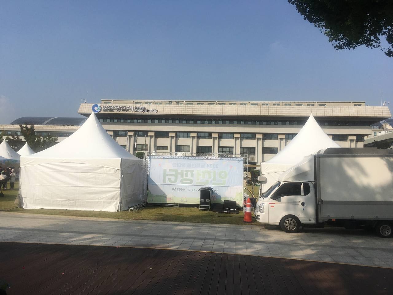아래의 사진을 보자. 인천광역시 청사 건물에서 우리의 집회를 볼 수 없도록 각종 천막과 게시판을 설치한 모습을 말이다. 이는 필시 인천광역시가 주민 단체끼리 인천애뜰 사용 문제로 서로 싸우게 만들기 위함이 분명하다. 행정 서비스가 정말 개판이다. 인천광역시는 즉각 이를 시정하고 관련자는 엄벌에 처해야 할 것이다.
