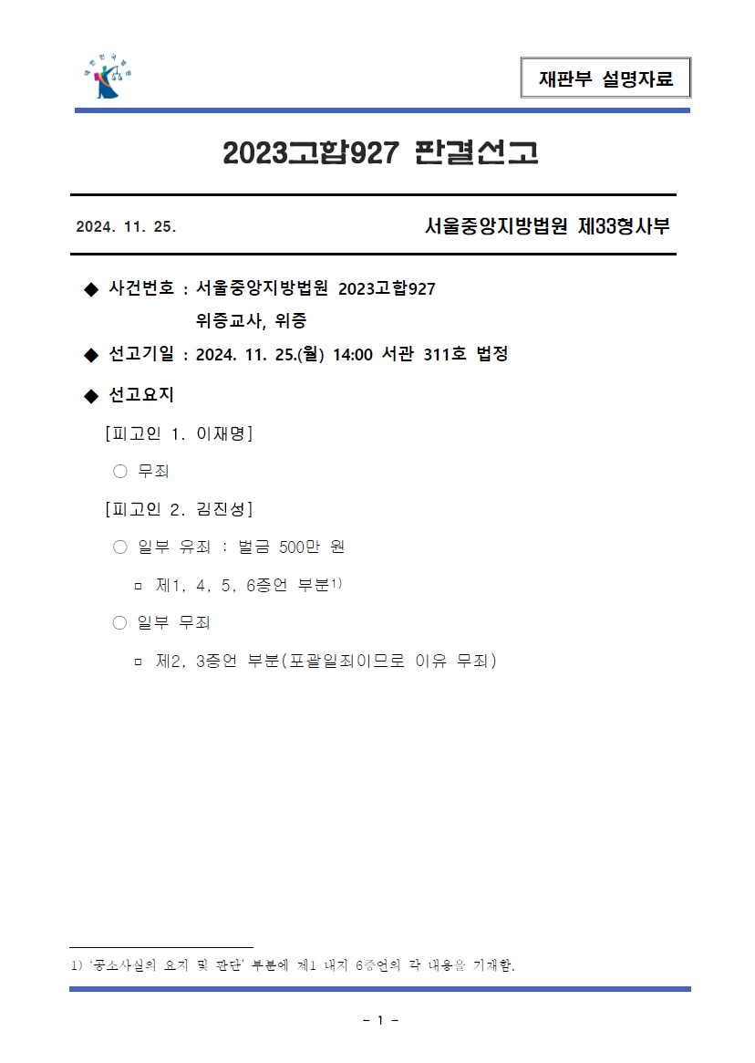 [ 참고 자료 : 서울중앙지방법원 제33형사부, 2023고합927 판결선고, 2024.11.25 ]