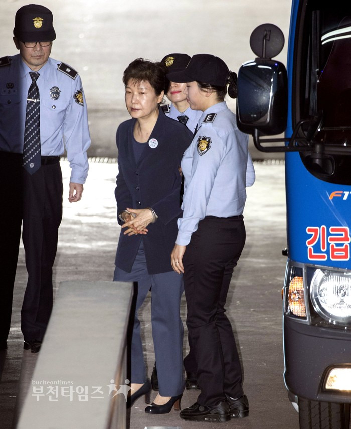 [ 참고 사이트 : 부천타임즈, [생생포토] 박근혜 전 대통령 수갑차고 417호 법정으로, 2017.05.23, http://www.bucheontimes.com/news/articleView.html?idxno=32683 ]
