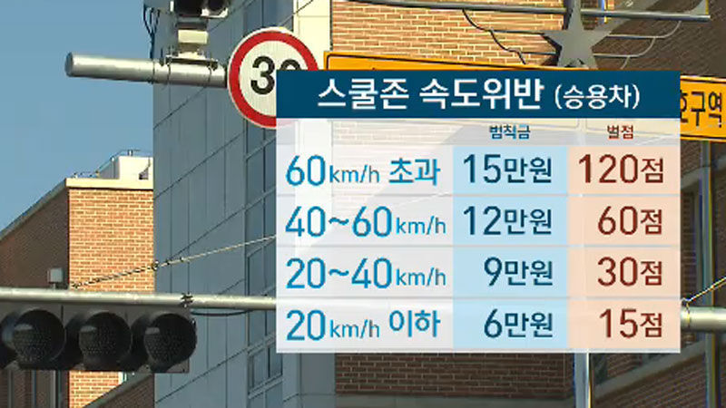 첫 번째 예시로 스쿨존에서의 차량 속도 제한이다. 스쿨존에서는 차량의 제한 속도는 30km/h이다. 그리고 스쿨존에서 속도를 위반하게 되면 교통사고처리 특례법 제3조와 제3조 11항에 의거, 2천만 원 이하의 벌금형 혹은 5년 이하의 징역형을 받게 된다. 또한, 스쿨존 내에서 차량이 충돌 혹은 추돌하여 어린이 상해 혹은 사망사고가 발생할 경우 특정범죄 가중처벌 등에 관한 법률 제5조의 13에 의거, 1년에서 15년 이하의 징역형이나 500만 원에서 3천만 원 이하의 벌금형을 부과받게 된다. 만약 어린이가 사망하게 될 경우 무기징역 혹은 3년 이상의 징역형에 처하게 된다. 스쿨존 속도위반의 경우, 아래의 그림을 참고하기 바란다.
