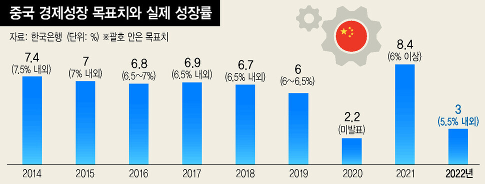 <출처, 한겨레, 중국 성장률 3%, 목표치 ‘반토막’…‘세계 공장’ 고속성장 멈췄다, https://www.hani.co.kr/arti/international/international_general/1076088.html >