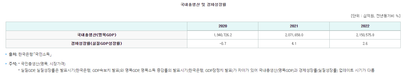 <참고 사이트 : e-나라지표, 2020~2022 국내총생산과 경제성장률, https://www.index.go.kr/unity/potal/main/EachDtlPageDetail.do?idx_cd=2736 >