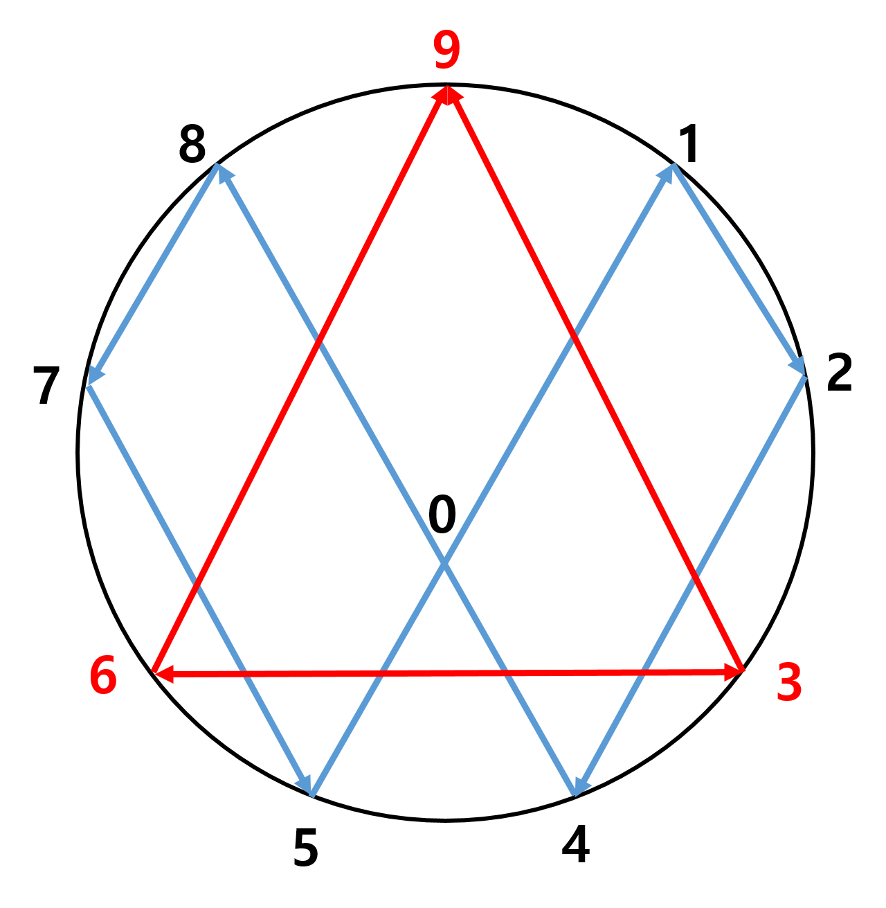 계산이 끝났다. 3과 6이 계속 반복됨을 알 수 있다. 그렇다면 9는 무엇일까? 9를 도출할 수 있는 식은 9의 배수 뿐이며 9의 배수가 아닌 수로 9에 도달하는 것은 오로지 3+6 = 9 뿐이다.