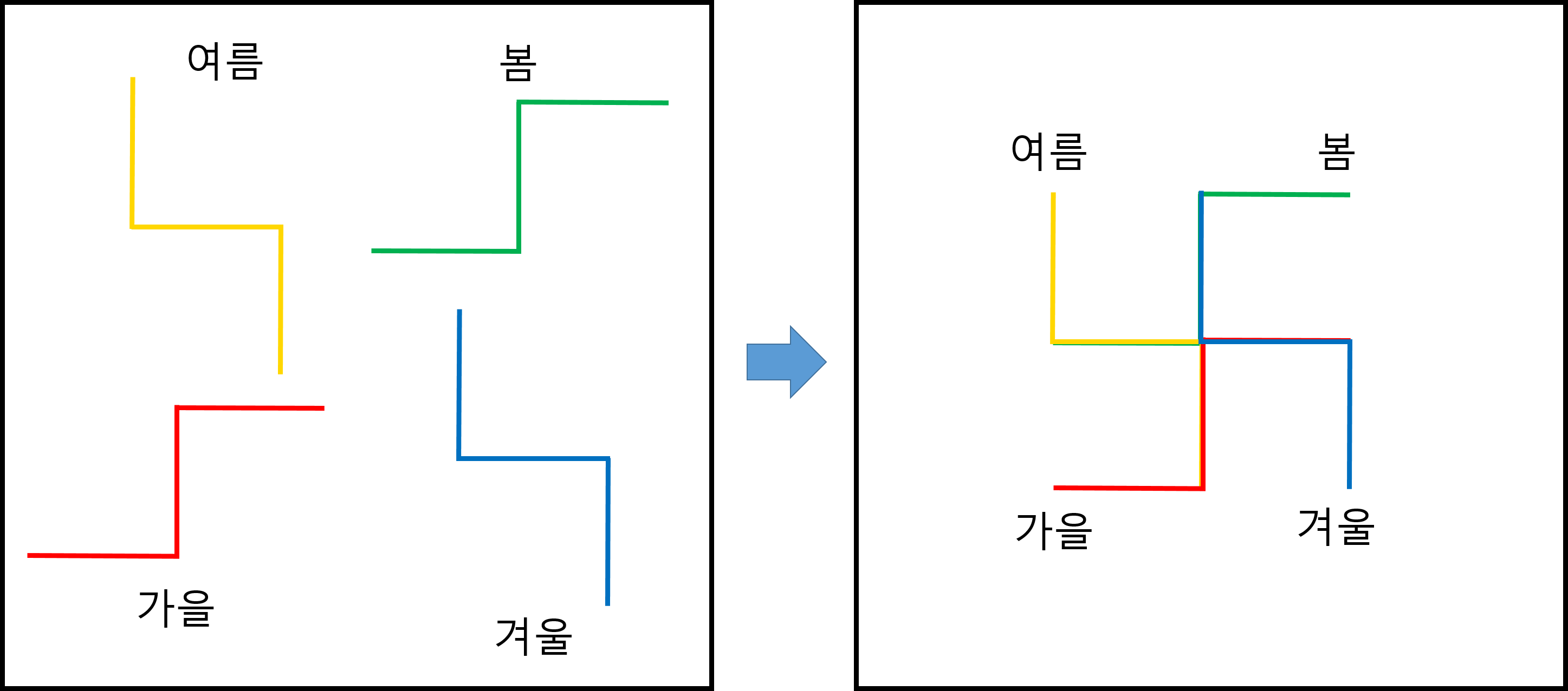 그리고 이를 조합해 보자. 동양에서 바라보는 북두칠성의 봄, 여름, 가을, 겨울의 형상이 된다. 이를 조합하면 아래의 우측 그림과 같이 만자 만(卍)이 된다.