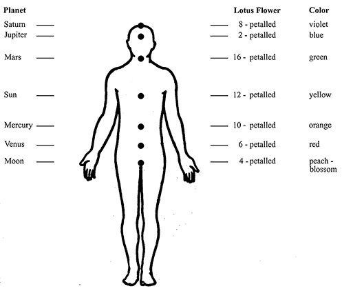 아래의 그림은 고대 차크라를 보여준다. 머리의 끝은 토성(Saturn), 이마는 목성(Jupiter), 목은 화성(Mars), 심장은 태양(Sun), 배는 수성(Mercury), 배꼽은 금성(Venus) 그리고 성기는 달(Moon)이다. 이 행성들은 육안으로 확인이 가능한 행성이다. 그래서 고대인들은 토성 밖의 세상을 저승으로 생각하였다. 이러한 사상을 확인할 수 있는 만화가 있으니 바로 드래곤볼이다. 드래곤볼에서 캐릭터가 사망하여 영혼이 되면 머리에 띠를 두르고 있는 것을 볼 수 있는데 이것이 토성 밖으로 간 영혼 즉, 저승으로 넘어갔다는 뜻이다.