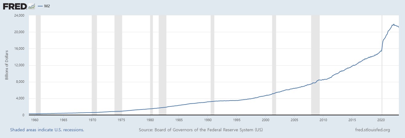 <참고 사이트 : 미국 세인트루이스 연방 은행, 연방 준비 은행 경제 데이터(FRED) M2 통화량 차트, https://fred.stlouisfed.org/series/M2NS# >