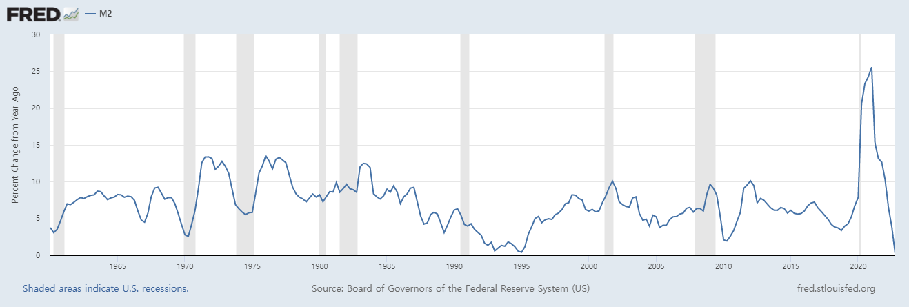 두 번째는 미국 M2 통화량의 현재연도/이전연도 변화율이다. 이 차트를 보면 심각성을 확인할 수 있다. 미국의 현재 M2 통화량은 가파르게 축소되고 있음을 확인할 수 있다. 2021년 1분기에 25.56%의 고점을 형성한 후 지속적으로 M2 통화량의 변화율이 하락하기 시작하였으며 2022년 4분기에 0.22%까지 하락하였다. 이 수치는 1960년 1월 1일부터 현재까지 단 한 번도 도달해 본 적이 없는 수치이며 1995년 1분기 0.41%보다도 낮은 수치이다.