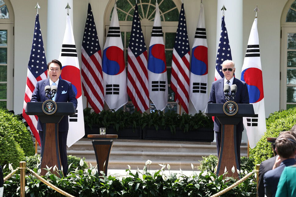윤석열 대통령과 조 바이든 미국 대통령이 26일(현지시각) 미국 워싱턴에서 정상회담을 열고 북한 핵·미사일 위협에 맞선 한-...